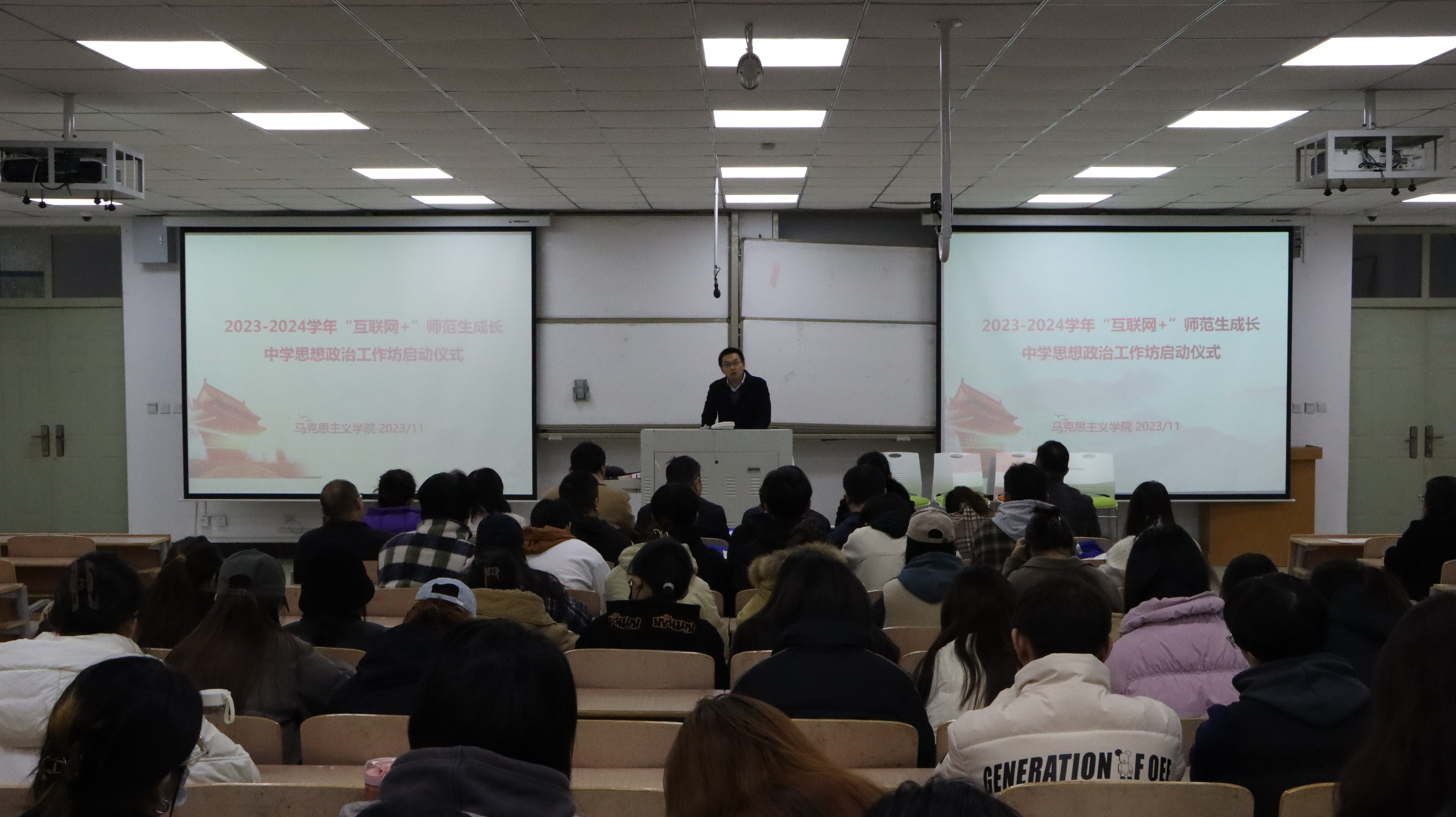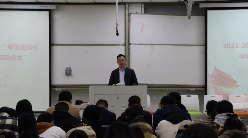 仪式伊始,林光辉老师介绍了思政工作坊的基本情况,详细解读了工作坊工作实施方案,并以亲身经历强调了教师教学能力培养、教学技能提升的重要性,要求坊主老师们履行好职责和精心指导坊员,勉励坊员们在工作坊各项培训活动中都取得优异成绩。司永海院长致辞,向参会的各位坊主老师表达了热烈的欢迎和诚挚的谢意,接着介绍了思想政治教育专业发展现状、人才培养目标和“2110” 实施方案,强调并充分肯定了思政专业师范生教育教学技能培养的必要性和工作坊培训模式的高质高效性,希望同学们珍惜这难得的学习机会,积极参与工作坊各项培训活动,虚心向坊主老师们请教,认真完成各项学习任务,在师傅“手把手”指导下不断提升自己的教师素养和教学技能。