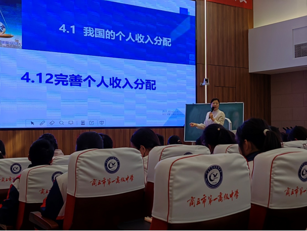接着观摩示范课。示范课由李婷老师执教,教学内容为高中政治必修(一)的《完善个人收入分配》一课。李老师通过回顾上一节课所学内容引入新课,通过重难点突破和材料分析题两个模块开展教学活动。在小组讨论时,通过分析社会现象和具体案例来探究财富分配的公平性和合理性,从而丰富了课堂教学的实践性和趣味性。这种启发式教学方法能够激发学生学习的主动性和积极性,提高其批判性思维能力,不仅增强了学生对课本知识的理解,也培养了他们分析和解决实际问题的能力。课堂结尾,李老师进行课堂总结,通过“对接高考”环节让学生加强对所学知识的应用。