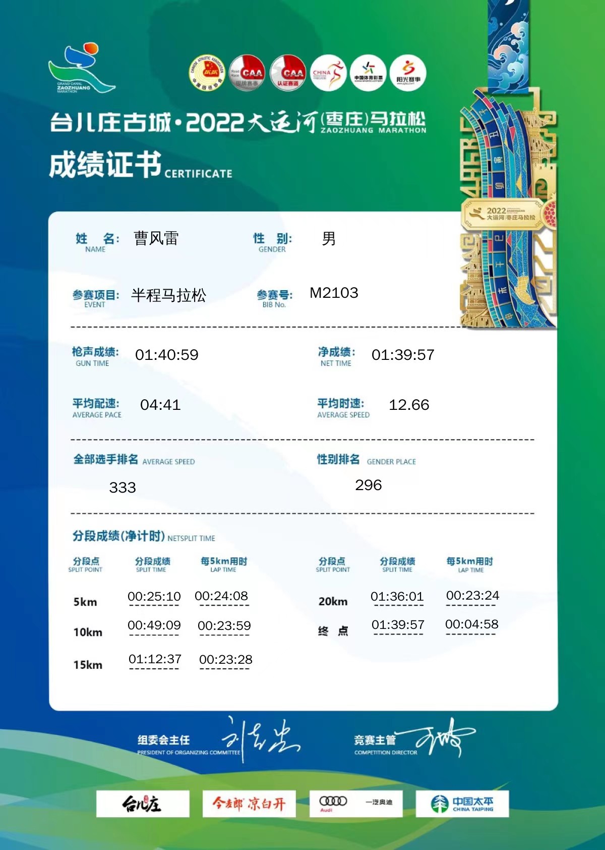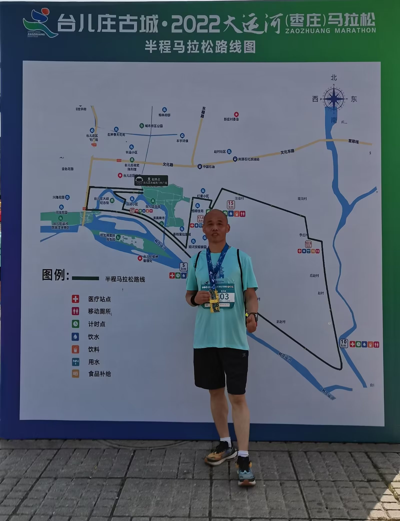 台儿庄古城·2022大运河(枣庄)马拉松于4月9日圆满落幕,来自五湖四海的10000名跑友汇集台儿庄古城参加了这场赛事。其中参加全程马拉松和半程马拉松的选手分别为1000人和3000人。0638太阳集团长跑爱好者曹风雷老师参加了半程马拉松比赛,并取得了该项目总排名第333名和男性排名第296名的好成绩。