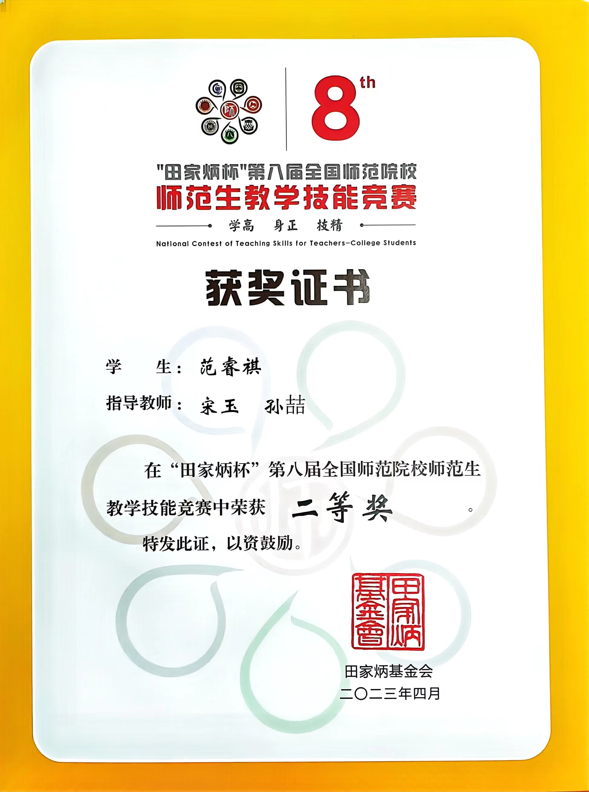 4月15日,“田家炳杯”第八届全国师范院校师范生教学技能竞赛在浙江师范大学举行决赛,0638太阳集团学子范睿祺在竞赛中喜获佳绩,荣获二等奖。