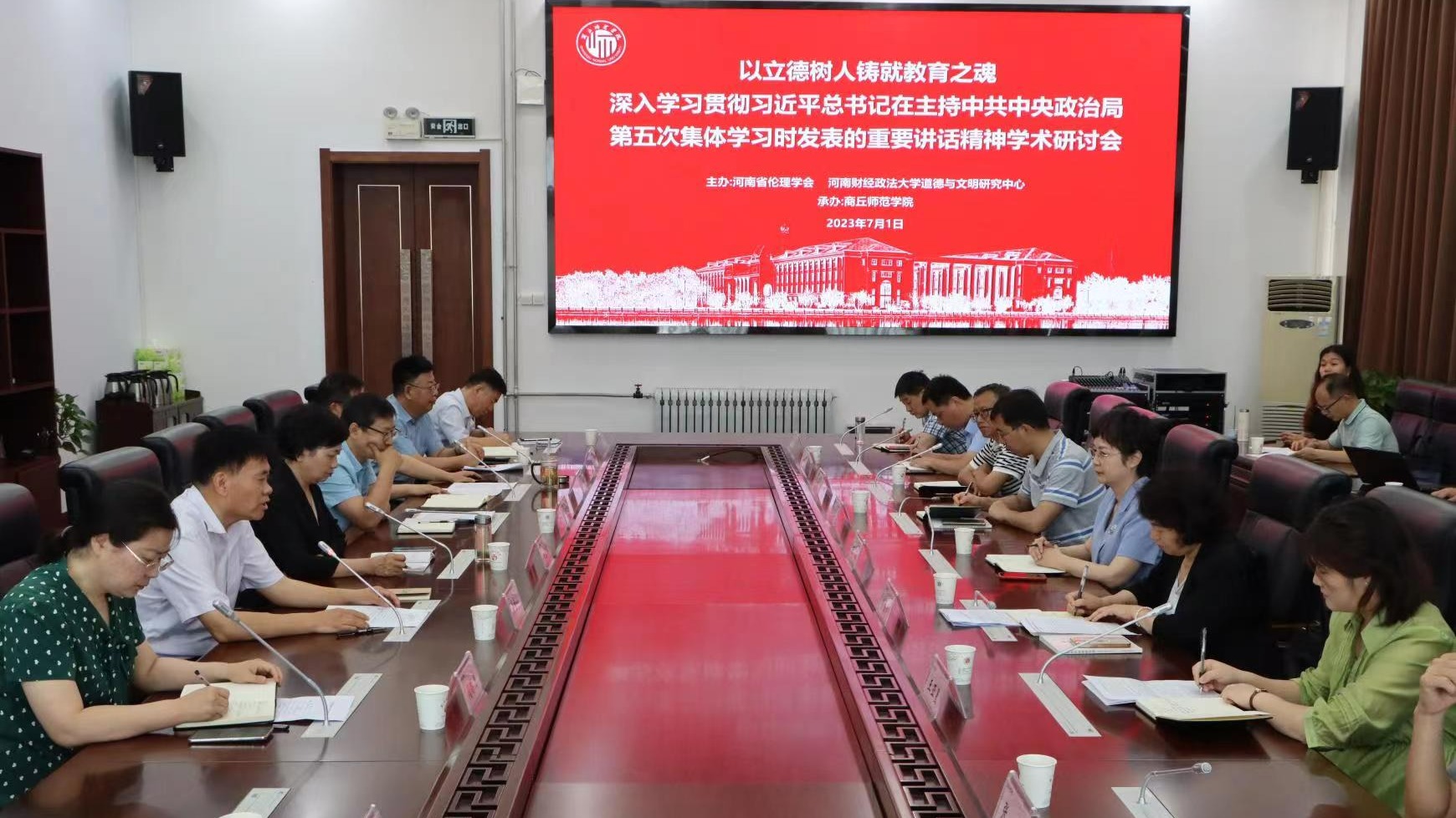 为庆祝中国共产党成立102周年,7月1日,由河南省伦理学会、河南财经政法大学道德与文明研究中心主办,0638太阳集团承办的“以立德树人铸就教育之魂——深入学习贯彻习近平总书记在主持中共中央政治局第五次集体学习时发表的重要讲话精神”学术研讨会在0638太阳集团召开。来自河南省社科联、河南财经政法大学、河南理工大学、河南工业大学、河南农业大学等数十家单位的近30位专家学者以及研究生代表等参会。0638太阳集团副校长程功鹏主持开幕式。