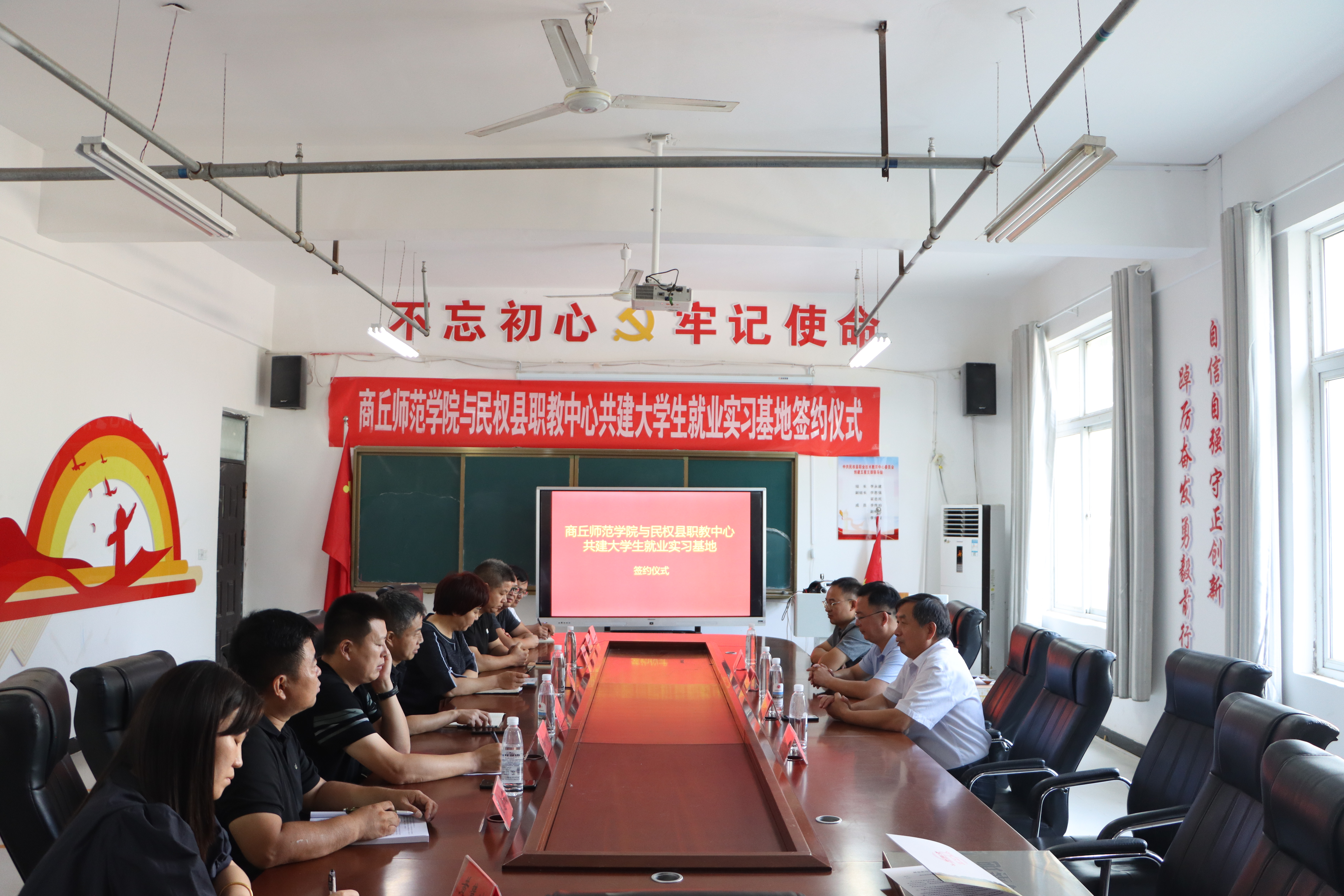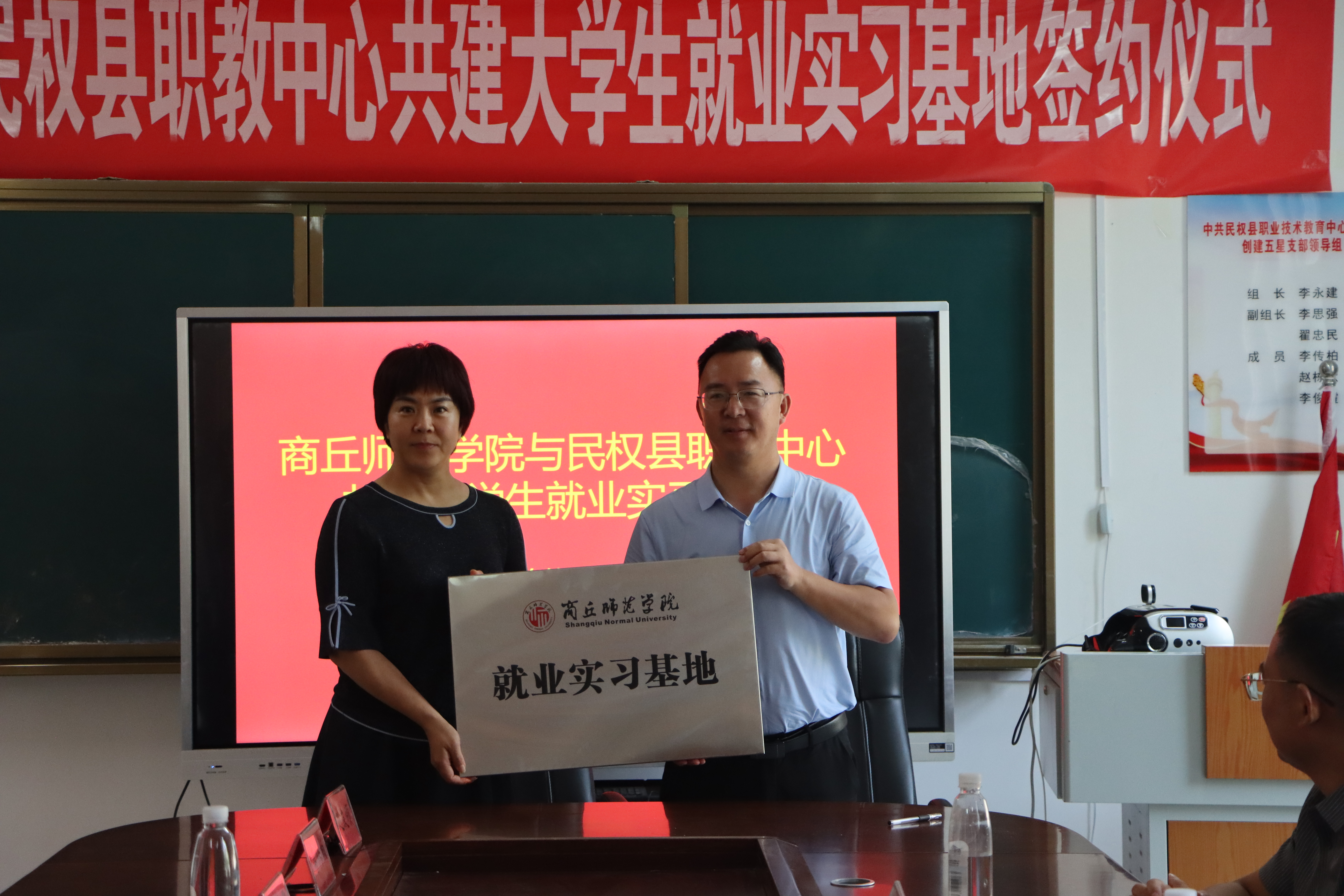 0638太阳集团院长司永海与民权县职业技术教育中心主任李杨签署大学生就业实习基地协议,举行了签约授牌仪式。