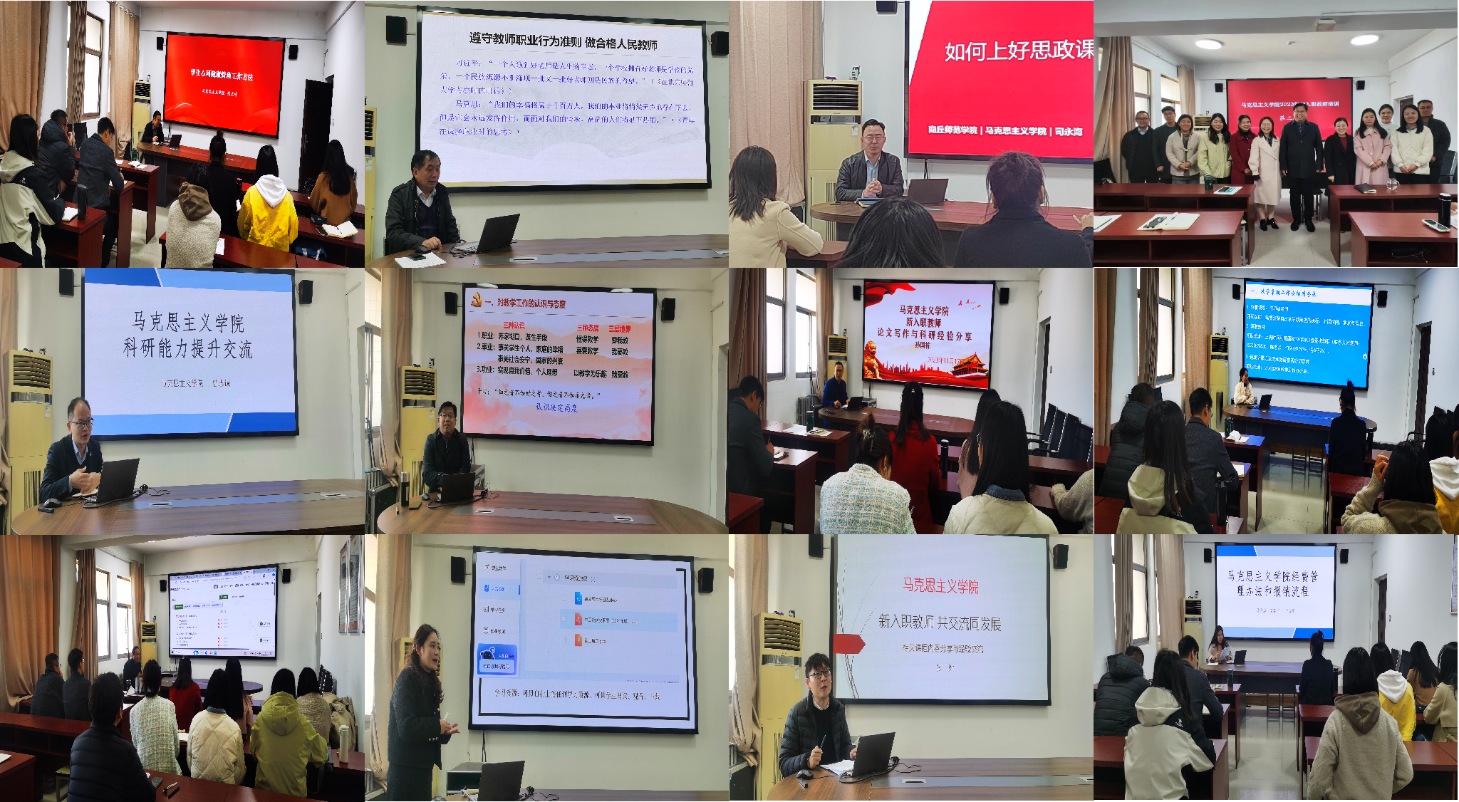包括龚志宏、司永海、张文涛、李东坡、丁亚仙、李霁月、朱坤、孙国栋、曾志诚、张灯、邱向玲、张晓雨在内的12名教师依次为新进教师作专题讲座,内容涉及师德师风、规章制度、教学方法、科研能力提升、新媒体技能等,为新进教师了解教学规范、进入教师角色、规划职业发展提供了视野思路与经验借鉴。