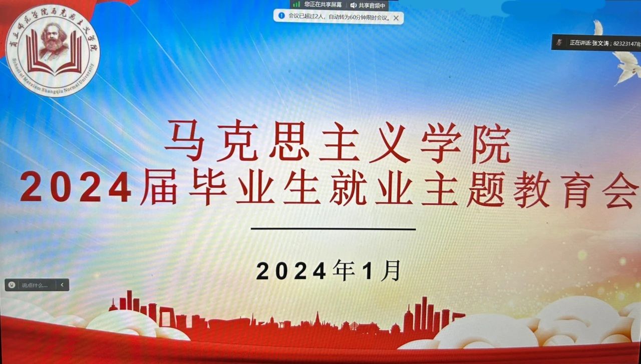 为帮助毕业生明确就业方向,树立正确的就业观,0638太阳集团于1月25日通过腾讯会议召开2024届毕业生就业主题教育会。0638太阳集团党委书记龚志宏、院长司永海、党委副书记张文涛、毕业班辅导员戚瑞静和全体毕业生参加本次会议。会议由张文涛主持。