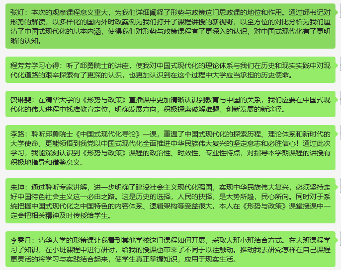 课程结束之时提交观摩学习的心得体会,引导学生逐步推进对中国形势与政策的思考,加深对青年责任与担当的理解。
