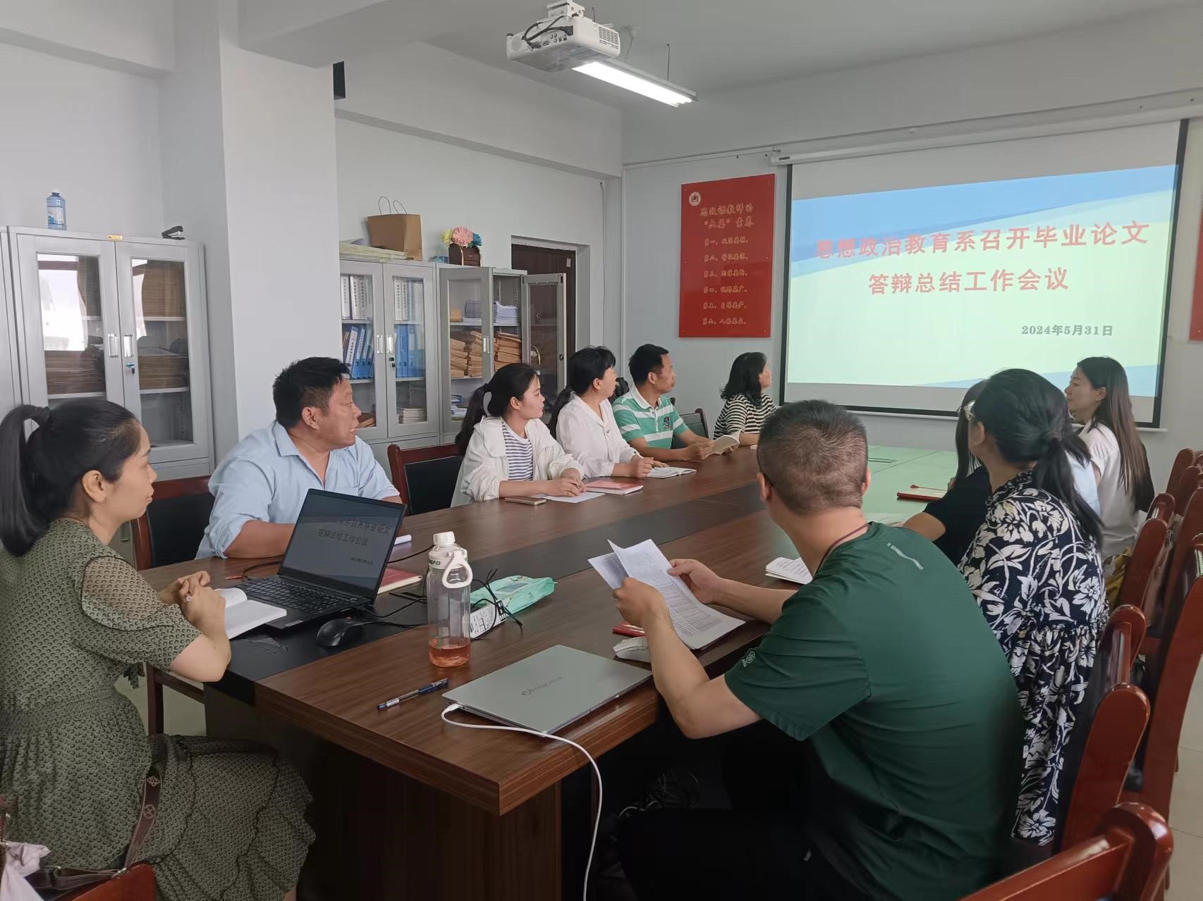 5月31日下午,思想政治教育系在应天楼809会议室召开毕业论文答辩总结工作会议,会议由思想政治教育系副主任赵娜主持。赵娜在总结中指出,2020级思想政治教育专业毕业生毕业论文答辩时间和地点都比较灵活,准备工作比较充分,答辩顺利进行。答辩过程中,评委老师以高度认真负责的态度指出了同学们毕业论文存在的问题,也提出了改进措施,为完善最终稿提供了最有力的帮助。另外,要求各论文指导老师在完善论文最终稿的过程中,要注意开题综述、中期检查、论文答辩申请表、指导教师评阅表、评审人评阅表、答辩记录、论文定稿、复制比检测报告、毕业论文成绩终评表以及毕业论文评审表的收取和保存,为师范专业认证和评估做好材料准备。