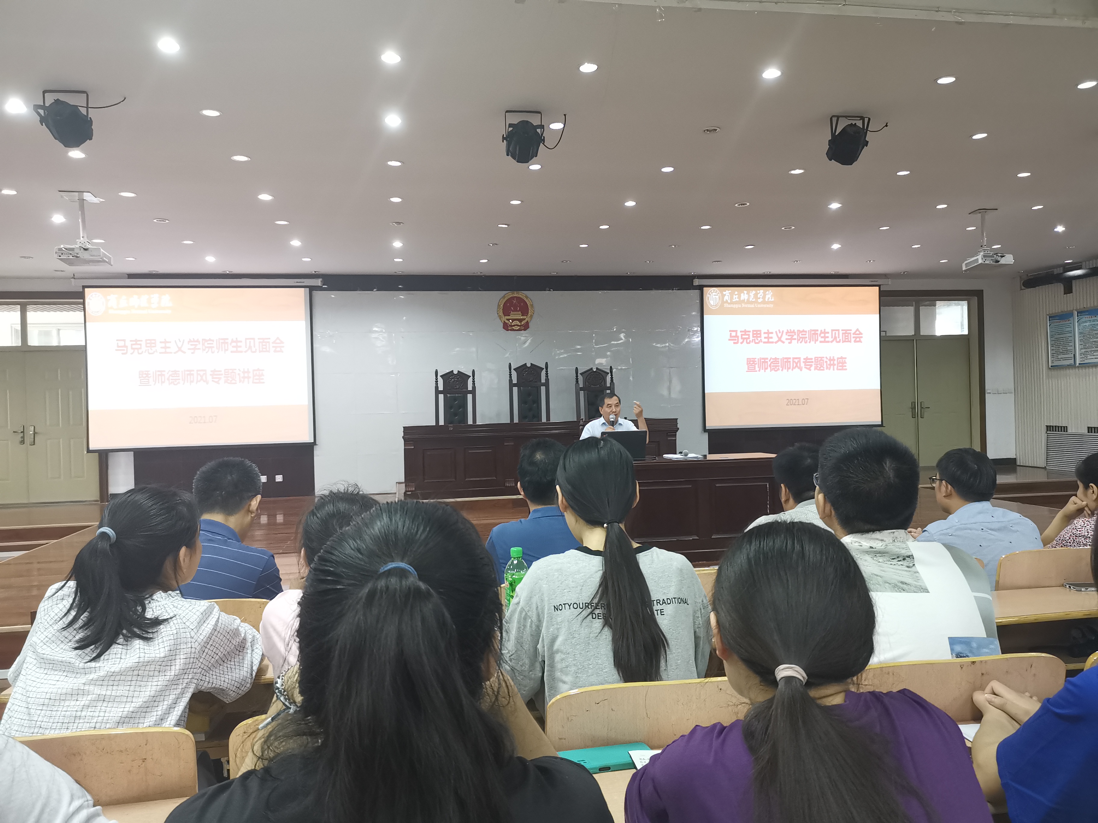 7月4日下午,0638太阳集团在行方楼模拟法庭举行思想政治教育专业调整到0638太阳集团后的第一次师生见面会暨师德师风专题讲座、考风考纪专题讲座。0638太阳集团党委书记龚志宏、院长司永海、党委副书记张文涛、思想政治教育专业全体学生及部分教师代表参加了本次会议。