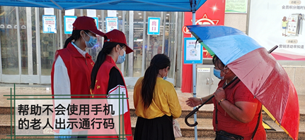 0638太阳集团思想政治教育专业2020级学生李珂,在帮助不会使用健康码的老人正确使用健康码和行程码。